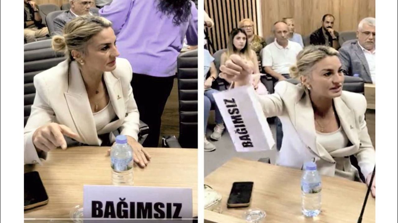 Elindeki “Bağımsız” yazılı kâğıdı kaldırarak oturma düzenine tepki gösteren İzmit, Cumhur İttifakı sıralarının yanına oturtulmasına da itiraz etti.