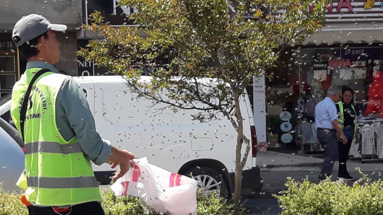Menteşe ilçesinin en işlek caddelerinden birisi olan ve araç trafiğinin eksik olmadığı İsmet Çatak Caddesi üzerinde koloni halinde uçan arılar dikkat çekti. Vatandaşların da ilgisini çeken koloni halinde uçan arılar vatandaşların meraklı bakışları arasında orta refüj içindeki bir ağaç kondular.